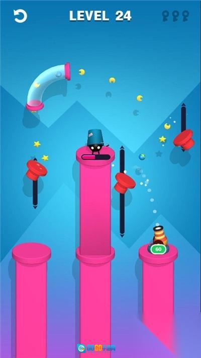 在多平台关卡里,通过操作按钮、管道来改变角色的移动路径,越过粉色柱子这一障碍,朝着带有“GO”标识的目标位置前进。