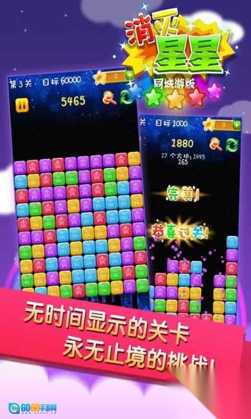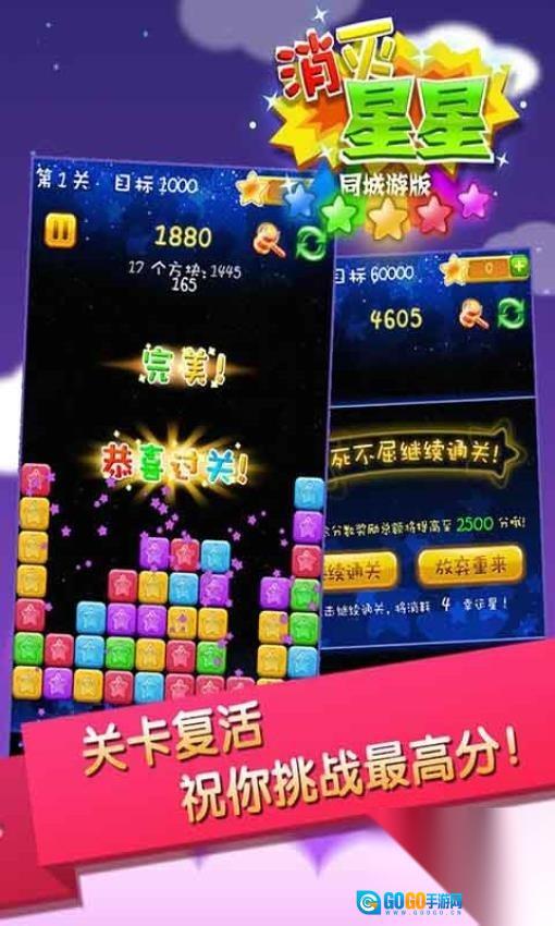 连续消除多个星块能触发分数翻倍,达到关卡指定分值后即可进入下一阶段。