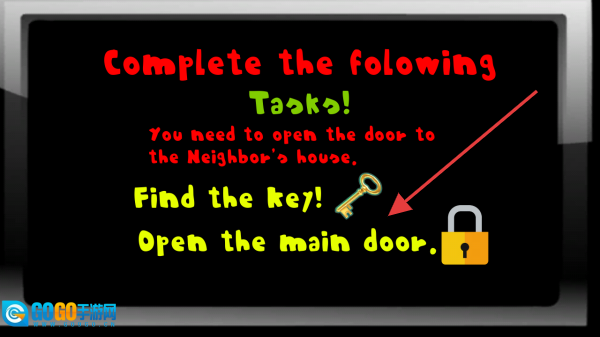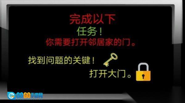 进入任务界面后,先确认清楚要完成的任务内容,接着找到钥匙并打开邻居家的门,然后按照游戏指引一步步推进流程。