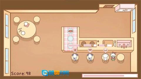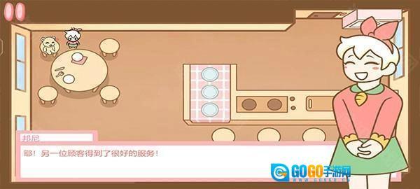 6、完成后,回到餐厅,将桌子上制作好的点心滑动到顾客面前,邦尼就会自动前往送餐,继续完成接下来的订单,招待顾客。