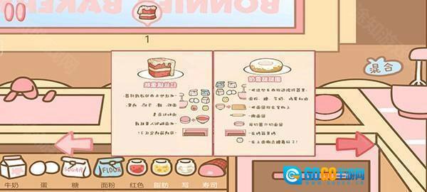 5、点击右下角的菜谱,点击可以翻动页面,按照步骤选择合适的食材放入工具内,制作需要的甜品。