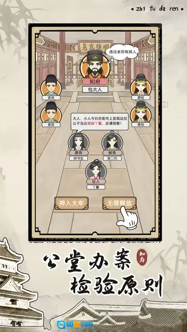- 公堂判案 —— 各种千奇百怪的随机案件,作为知府你是否真的能秉公处理,不同的办案选择将会影响游戏的走向。