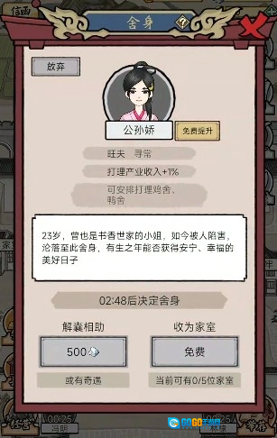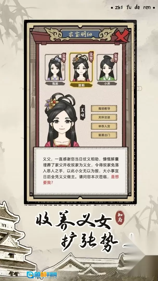 - 收养义女 —— 在这个乱世之中,总会有些可怜人儿出现,在这里你可能有机会能遇到一些身世坎坷的可怜女子,如处理得当将有机会将其收为义女。
