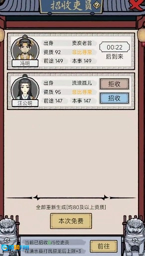 - 招收官员 —— 一个有实力的知府,身边少不了文武能人,在这里你可以根据你的喜好,招收各具特色的差役和吏员,他们将可以帮你分担不少日常事务。