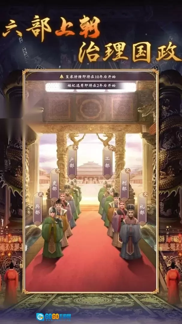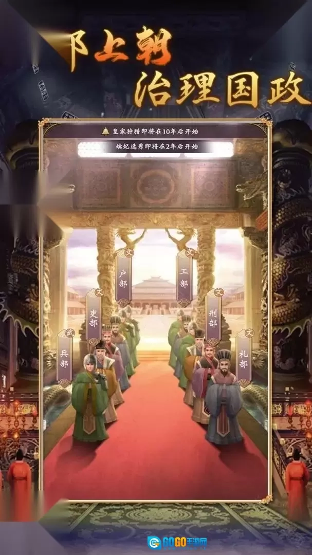 2、首先是上朝,随机点击兵部、礼部等上书奏折,根据选择来获取/减少声望、政务。