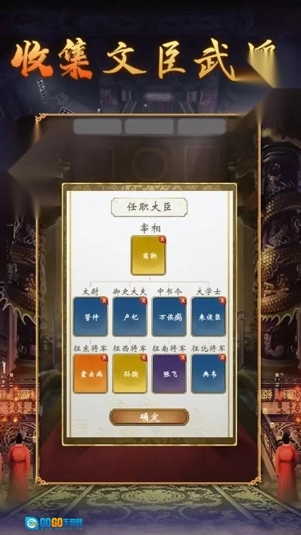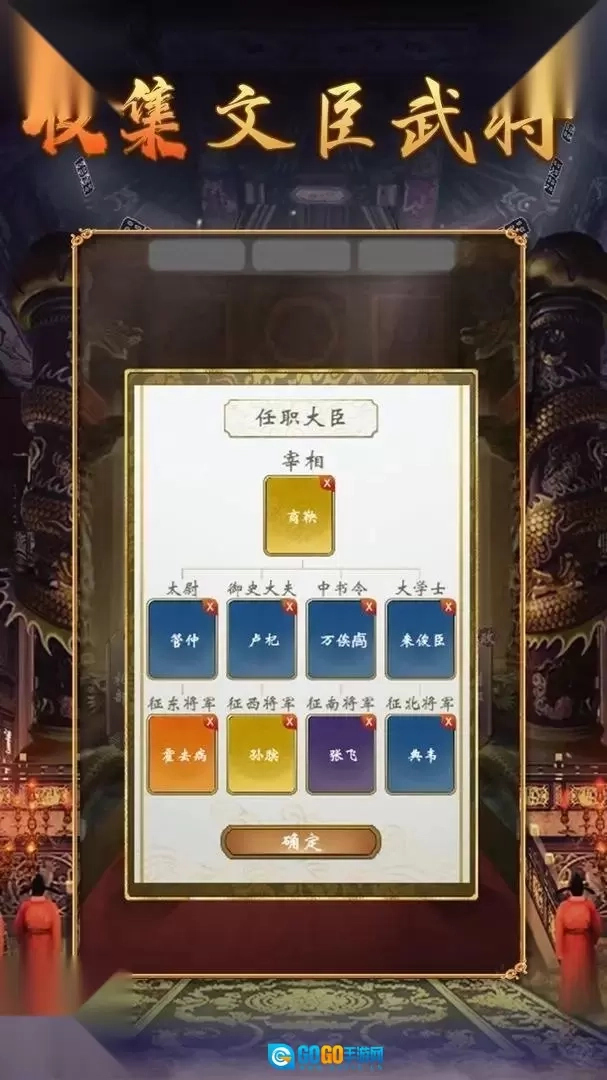 2.每个角色都有详细的介绍,玩家可以点击角色查看将军、国库、舆情等属性值。