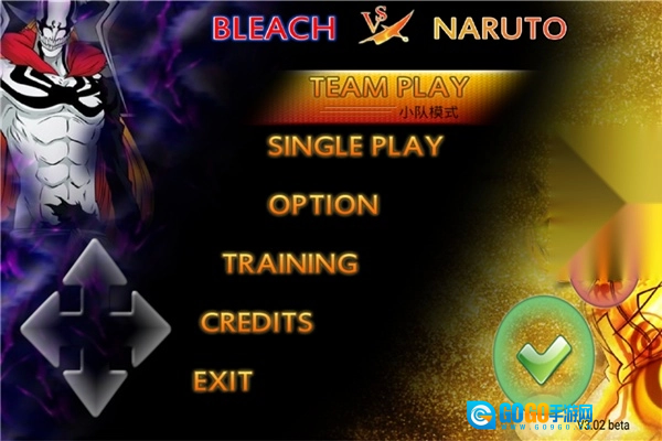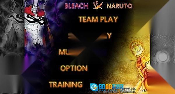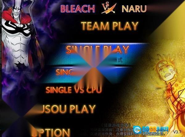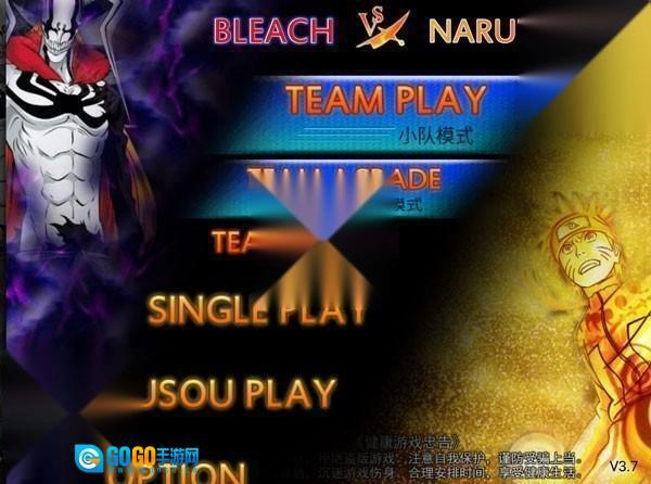1、启动《死神vs火影》游戏,接着进入玩法模式选择界面,这里有小队模式TEAM PLAY、单人模式SINGLE PLAY以及无双模式MUSOU PLAY可供挑选。