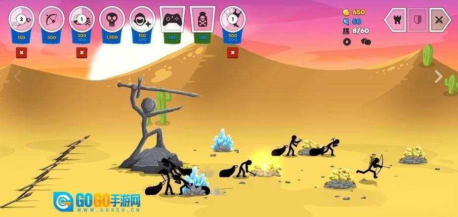 技巧:(需要手不残,抛物线计算准确,手机的屏完好)开局造一个弓箭手,控制,往前走几步,观察敌军的弓箭手,矿工等的位置,用超远距离冷射♂直接在己方雕像附近击毙对方