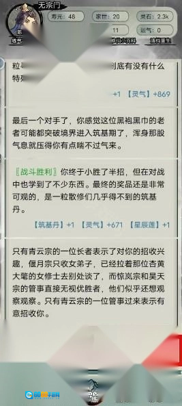 要是玩家既没选前两种属性加点,前期也没触发直升青云宗或青云宗弟子选拔的剧情,也不用着急,你依然有成为青云宗弟子的机会。当你的年龄超过17岁,并且还停留在练气期时,就有概率遇到参加仙门大会的剧情(被青云宗逐出宗门的弟子无法参与)。只要在大会上战胜几个竞争对手,就能获得加入青云宗的机会。