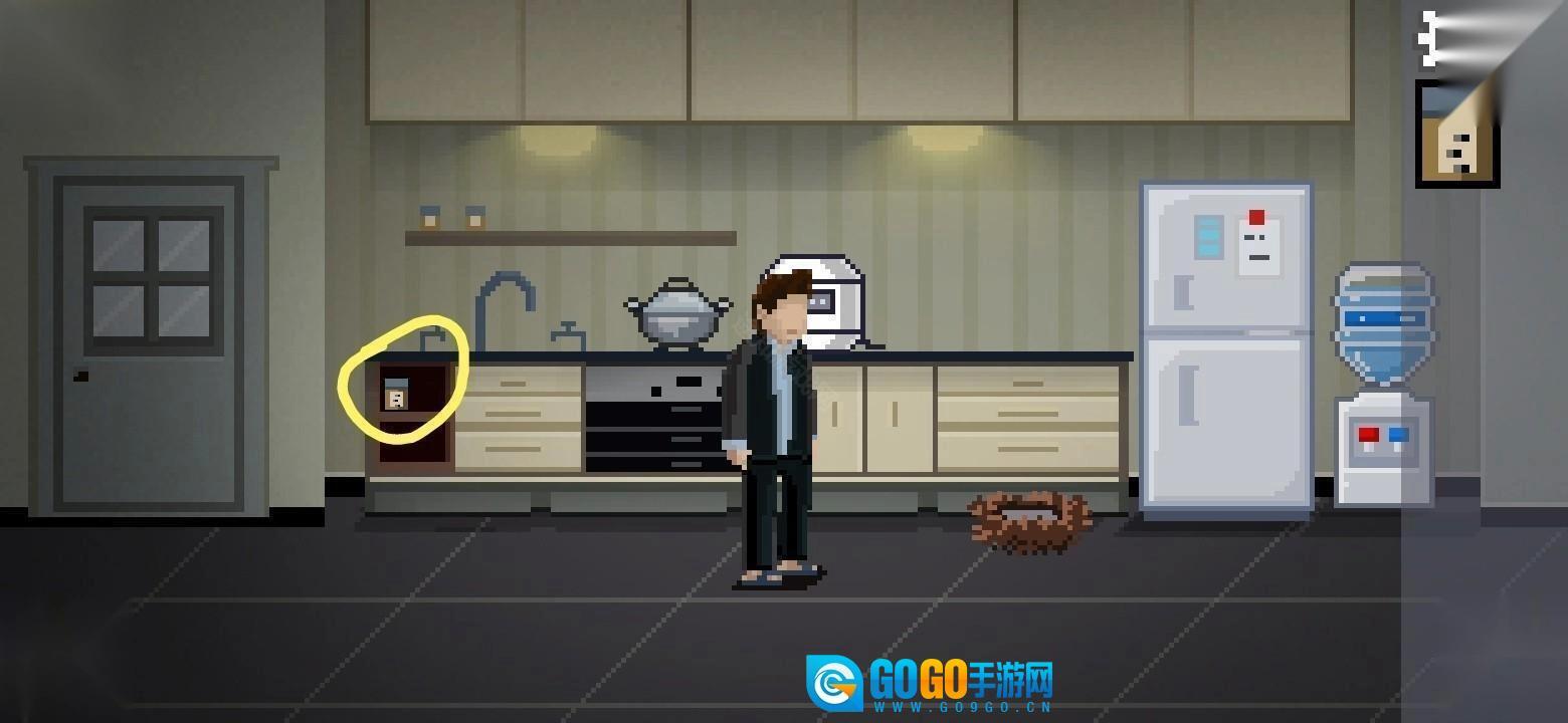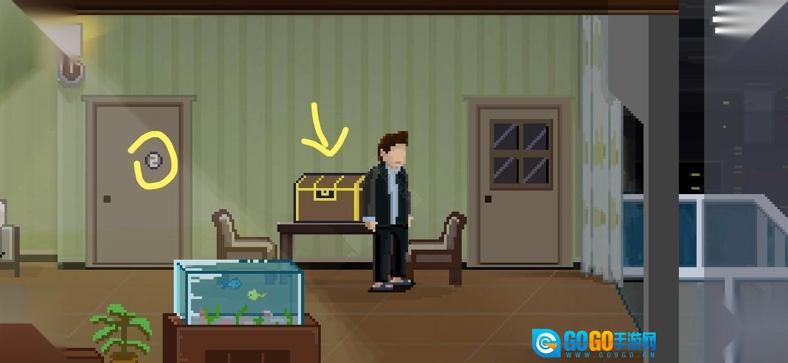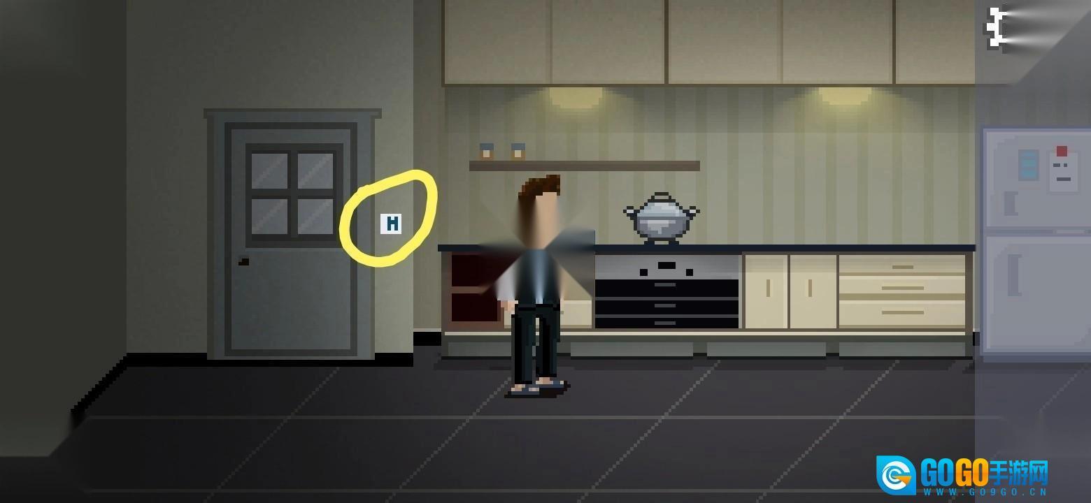 按一下墙上的白色机关,上面有一排按钮,下面有四个提示,按提示把上面四个柜子的把手都转到左边,会掉落钥匙。点击妻子,提示凶手在右边,好的继续往右走。