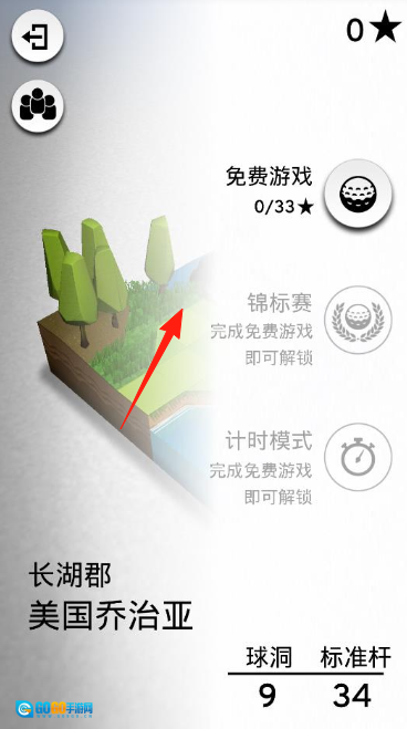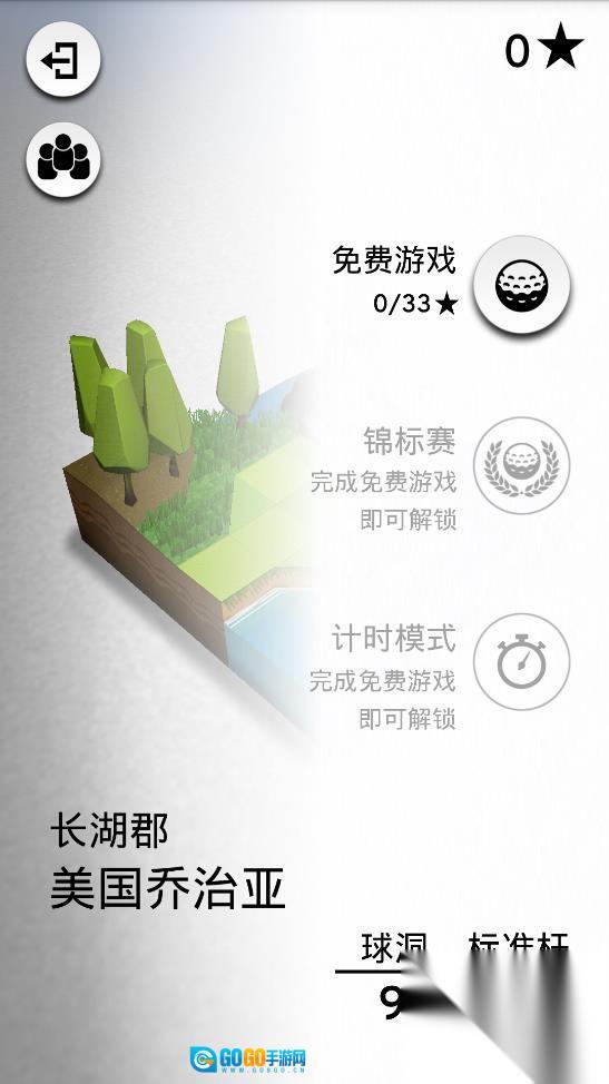 模式选择主界面设有“免费游戏”“锦标赛”“计时模式”三个选项,需完成免费游戏0/33★的任务才能解锁其他模式,场景设定为“长湖郡美国乔治亚”。