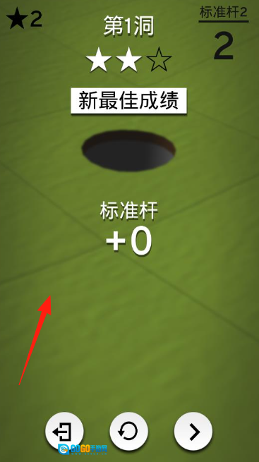 成绩结算已完成“第1洞”,系统显示“新最佳成绩”与“标准杆+0”,可获得2颗星级★,成功推进关卡,接下来可挑战更多球洞。