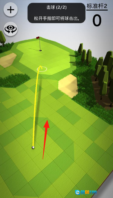 在高尔夫球场上进行击球操作时,拖动屏幕以控制击球轨迹(黄色线条),松开手指即可完成击球,按照完成击球2/2这样的步骤推进,最终让球成功入洞。