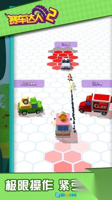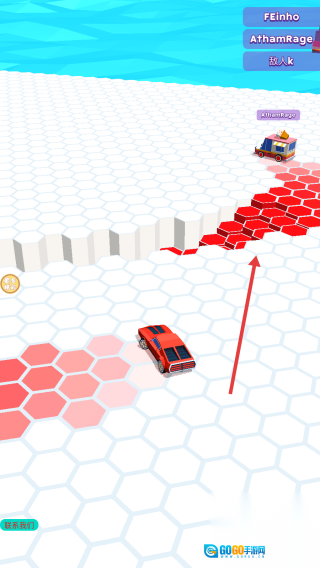 避开呈水晶状的红色危险区域,沿着安全的六边形区域推进,追赶前方的车辆以争取领先位置。