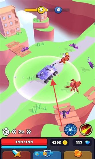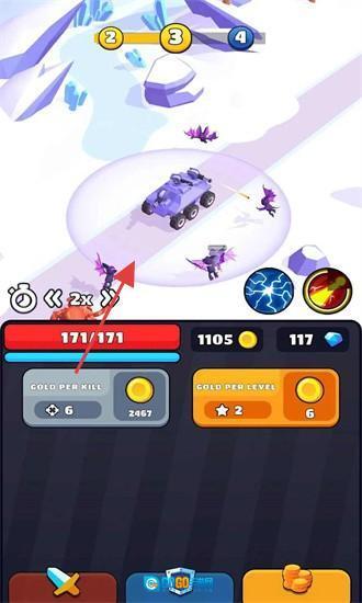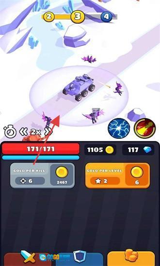 战斗时,借助战车技能清理怪物,收集“GOLD PER KILL/COVER”资源,用来升级战车、解锁新地图,不断进行冒险。