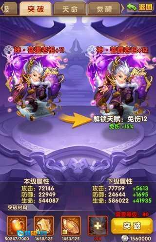 突破提升神将属性,开启神将天赋需要消耗突破石,突破三次后需要消耗同名卡牌。