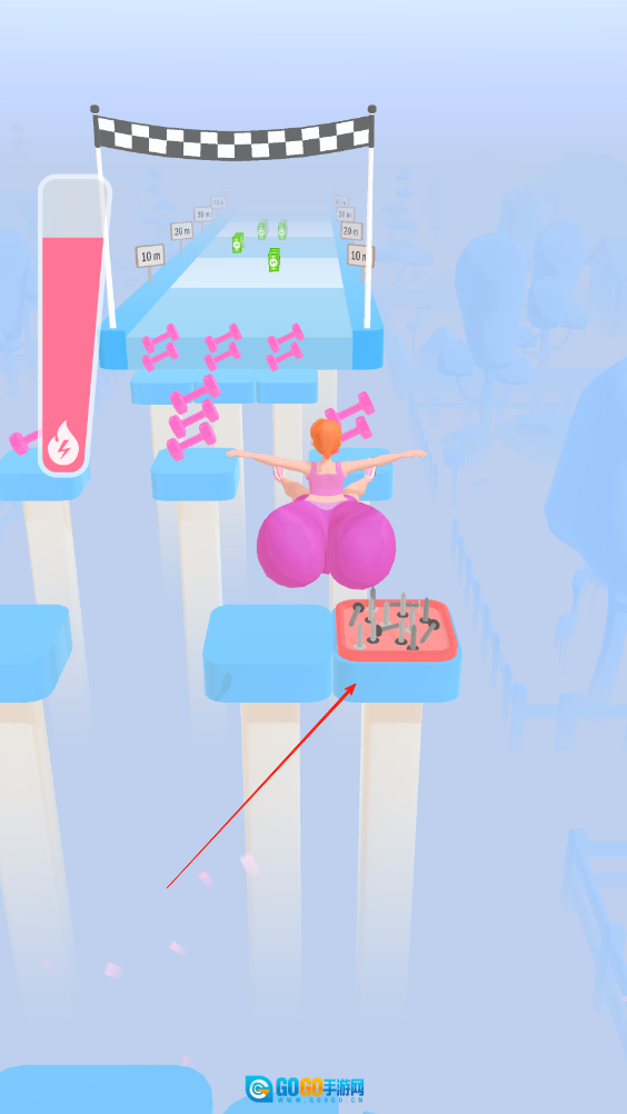 成功抵达终点后,左侧进度条会呈现收集到的哑铃数量与储存的力量值;抵达终点后还会在滑行道上滑行以收集金币,滑行距离越远,收集到的金币数量就越多。