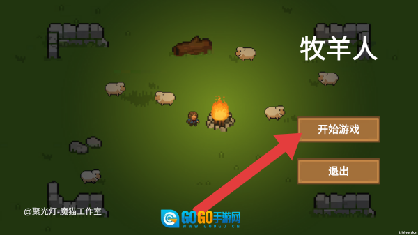 需点击“开始游戏”按钮才能进入游戏,映入眼帘的是像素风格的草原场景,其中包含羊群、篝火、人物以及石块、木头等元素。