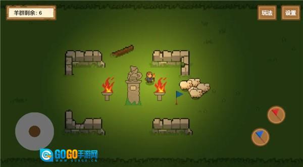界面上显示着羊群剩余数量为6,画面采用像素风格绘制出草原场景,其中包含羊群、篝火、牧羊人角色以及其他人物,同时还有操作摇杆、方向标识等各类元素。
