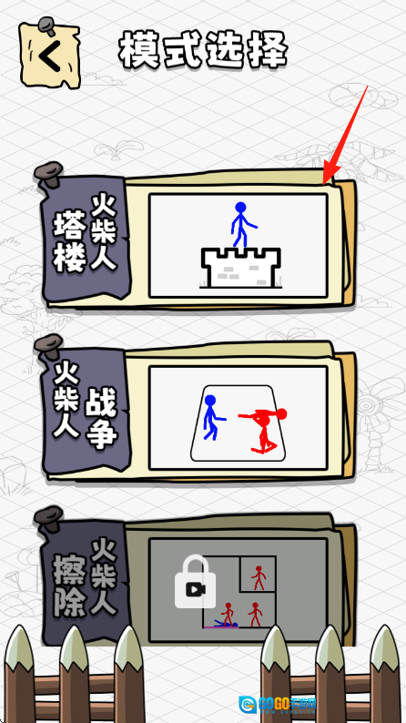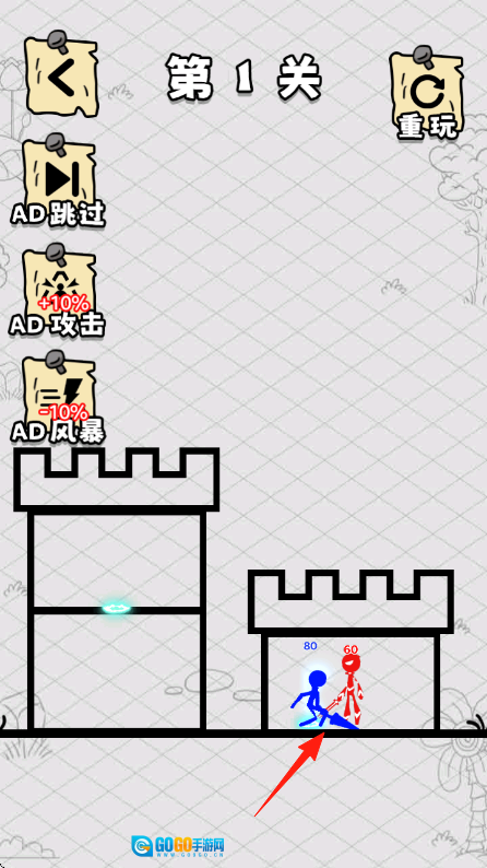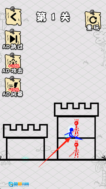 进入游戏后,在模式选择界面选择火柴人塔楼模式,进入第一关,操控蓝色火柴人抵御红色敌人的攻击。