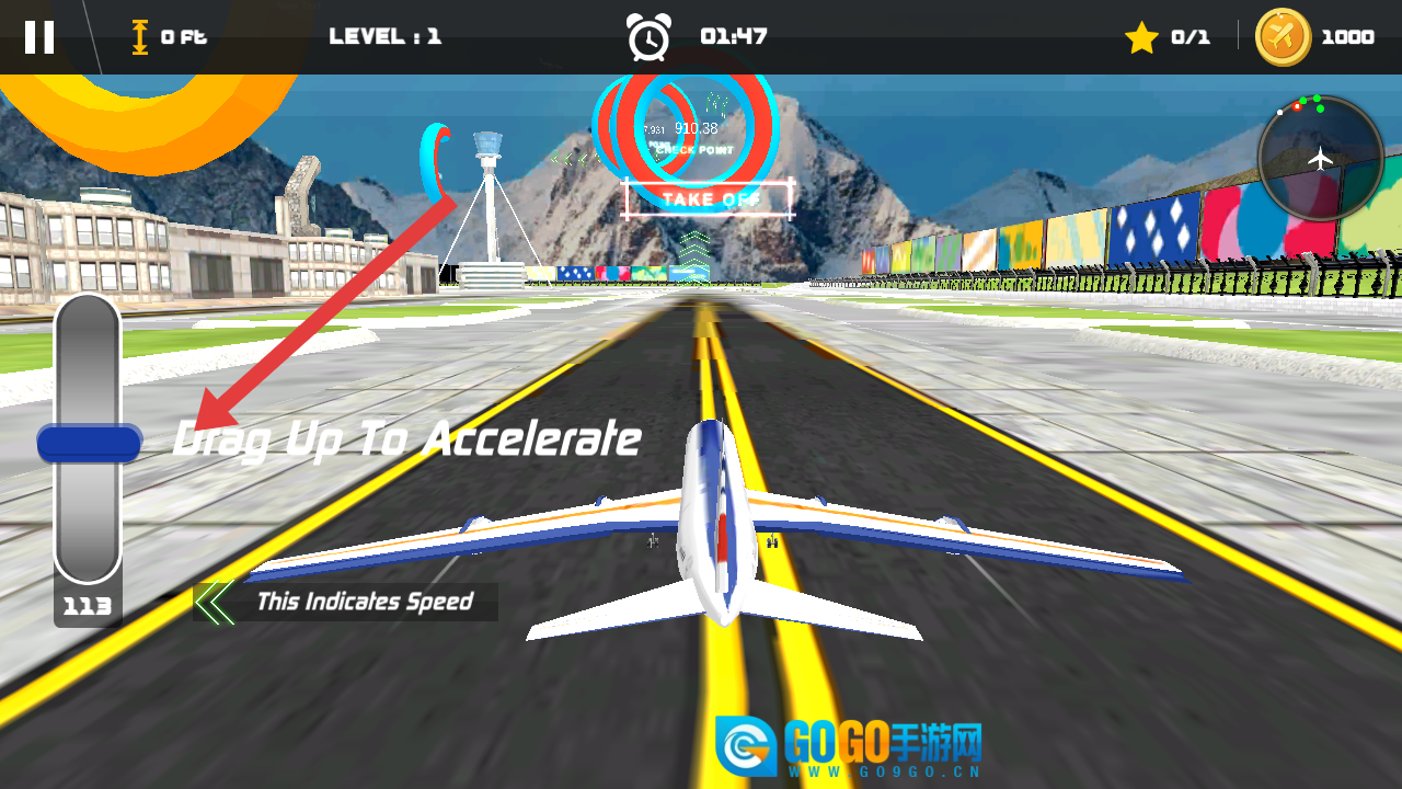 需要拖动左侧的加速条向上,依照系统提示“Drag Up To Accelerate”来增加飞机的速度,为起飞积蓄力量。