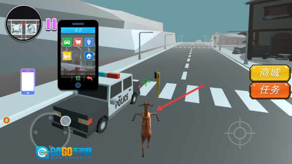 在游戏场景里,玩家操控鹿角色于城市街道间移动,界面会呈现手机、商城、任务等功能按钮,借助这些功能能够完成相应任务。