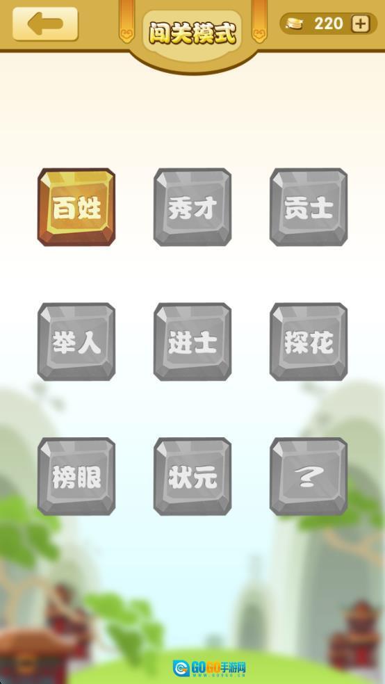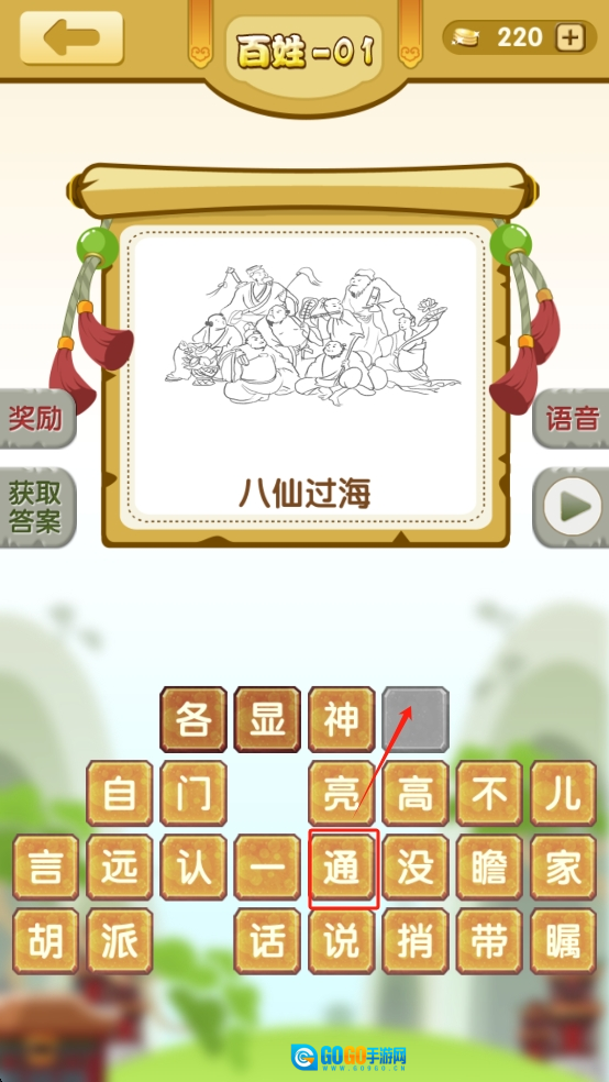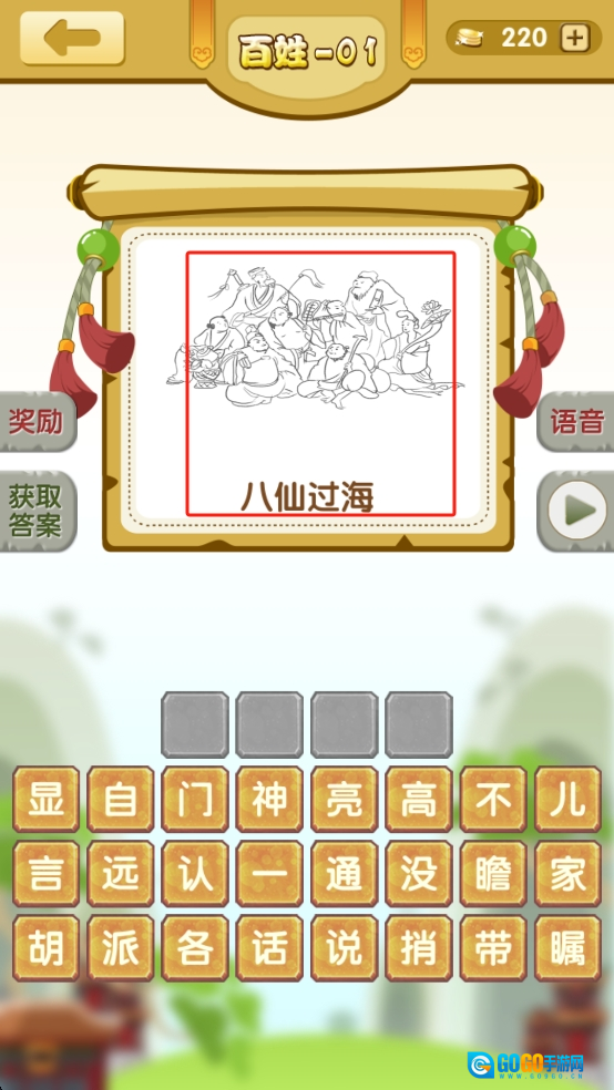 游戏开始时,我们先选择关卡进入,关卡的画面以八仙过海为主题,下方排列着许多汉字方块,需要从这些方块中挑选出和画面相关联的字。