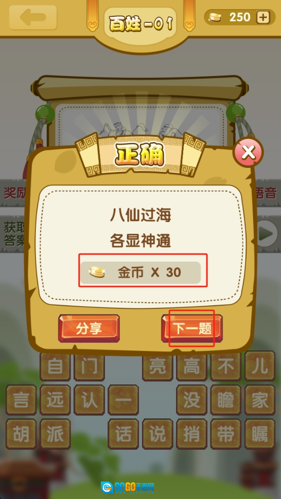 正确拼出成语后,界面会弹出奖励提示,显示获得30金币,点击下一题按钮,即可进入新的猜成语关卡继续挑战。