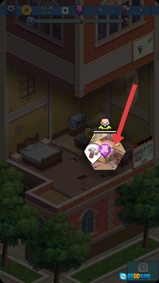 开始游戏后,先点击角色旁边的资源,使用道具来触发改造,这样能快速启动房间升级的流程,进而积累基础升级的进度。