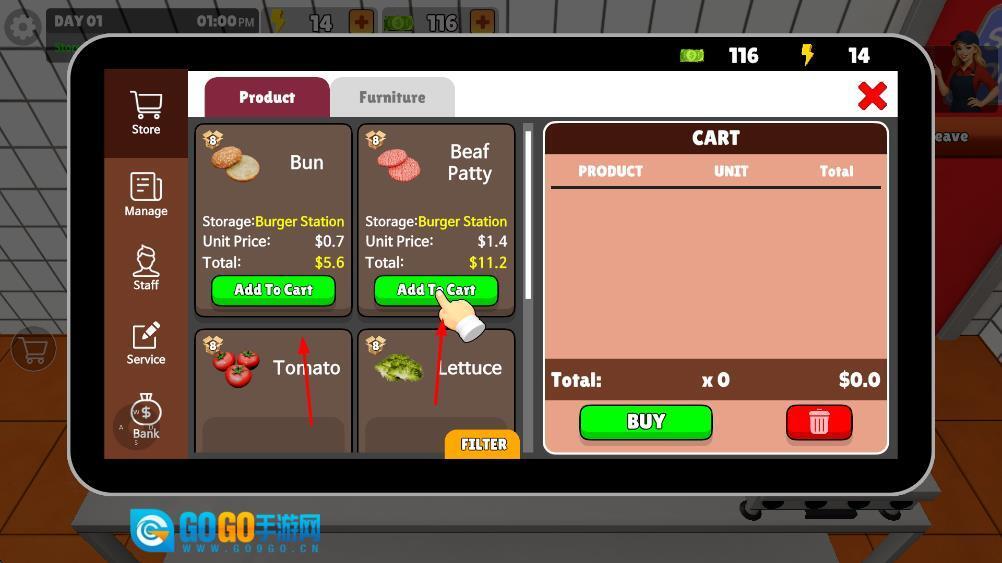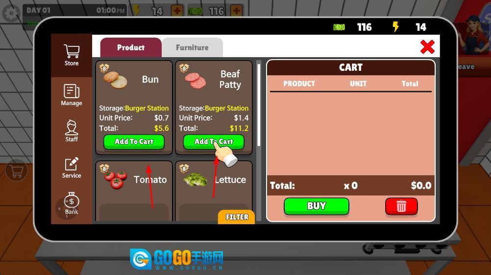 进入商店页面,把面包Bun、牛肉饼Beef Patty这类食材添加到购物车然后完成购买,以此补充制作汉堡所需的材料。