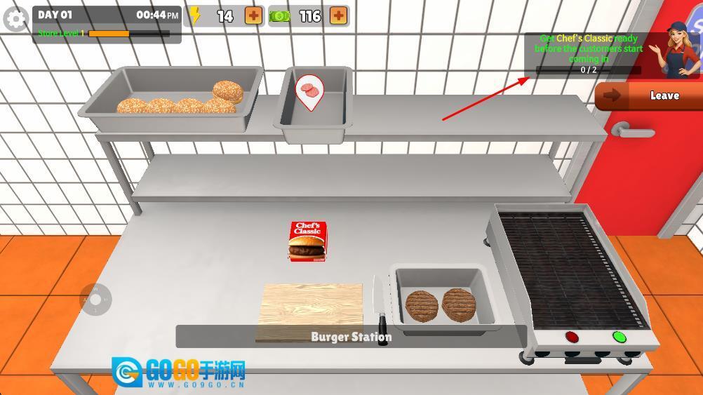 在厨房区域,要在顾客抵达之前备好Chef's Classic汉堡,依照提示启动汉堡的制作流程,以便为迎接顾客做好准备。