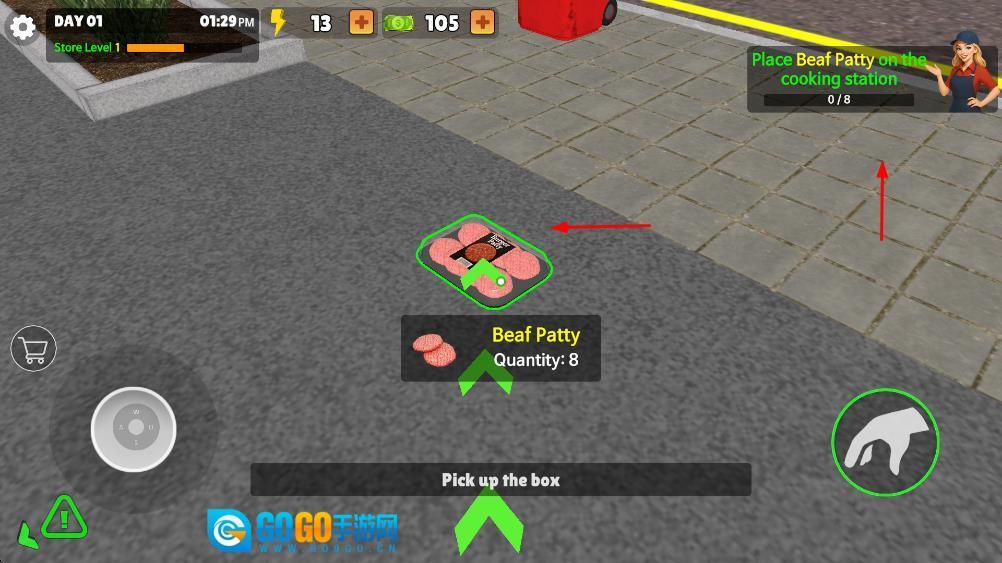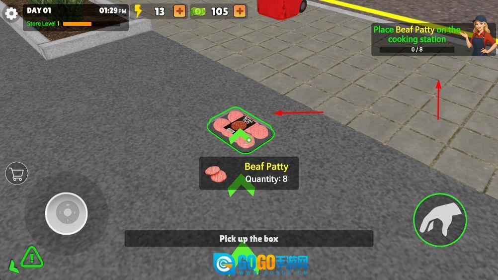 到店外取走装有牛肉饼的箱子,拿到食材后回到厨房,给烹饪环节准备原料。