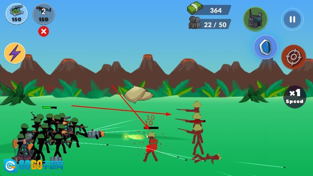进入对战场景后,指挥装备枪械的火柴人部队向敌方发起进攻,注意关注上方的资源储备与兵力上限,以合理的策略推进战斗进程。