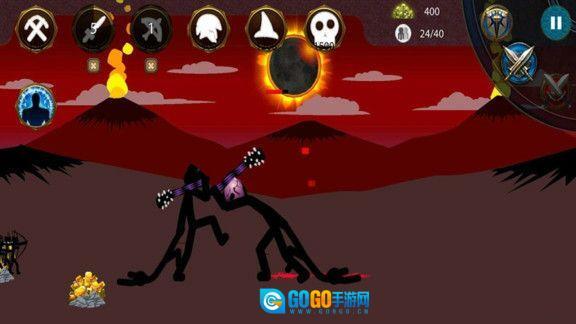 不断开采金矿,借助资源来升级武器或者招募更多火柴人,以此增强火柴人王国的实力。