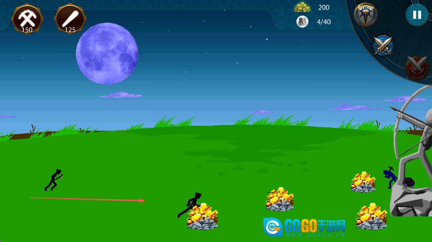 进入游戏后,操控黑色火柴人朝着金矿堆所在的方向移动以收集资源,同时注意观察上方显示的200金矿数量。