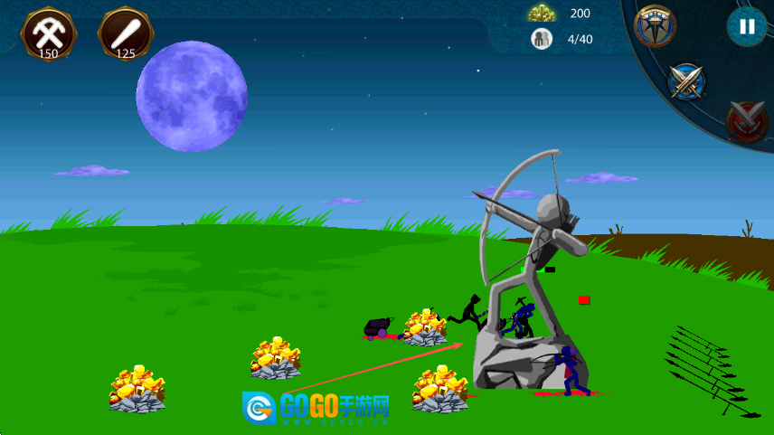 当看到灰色弓箭手火柴人雕像和蓝色敌人时,指挥黑色火柴人靠近金矿进行开采,同时要避开敌人的攻击。