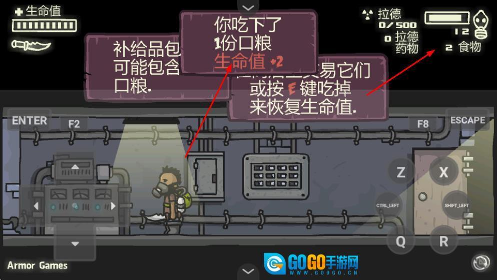 拿到补给品包后,按下E键食用口粮来恢复生命值,另外要留意拉德、药物、食物这类资源的数值,以此保障生存所需。