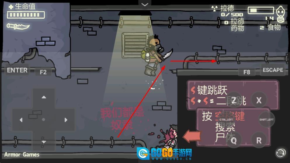 你需要操控角色在场景里移动,按S键可以让角色跳跃,按空格键能搜索尸体,从中获取资源或者线索,遇到敌人的时候就用武器进行攻击。