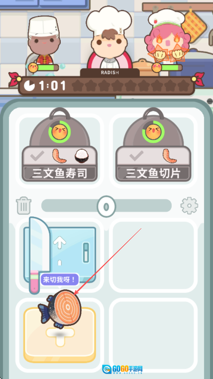 将三文鱼放到砧板处,根据提示点击刀具进行切割。