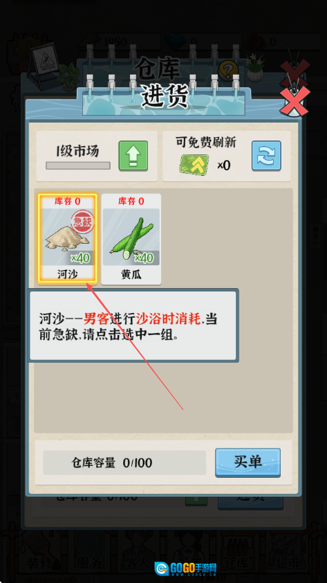 进入仓库的进货页面,勾选目前急缺的河沙,点击下单来补充库存,以此满足男性顾客的沙浴需求。