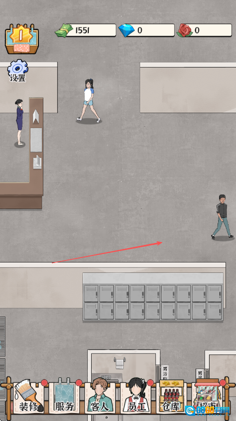 进入浴场场景后,先引导客人前往对应的区域,完成基础的接待工作,以此积累初始的运营资金。