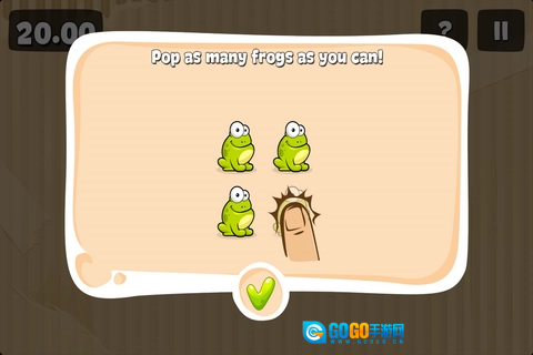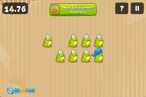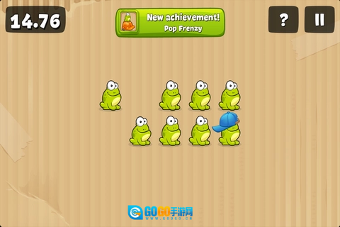 这是最简单的一关,规则很简单,就是把屏幕上跳出来的青蛙戳破,而且有时间限制,戳破的青蛙数量越多,得分就越高。我玩的时候通常是两只手一起操作,这样能更快地戳到更多青蛙。不过有些青蛙比较特殊,它们戴着帽子,这相当于有一层防御,得先把帽子戳掉,再戳一下青蛙本身才算成功。还有些青蛙更厉害,戴着安全头盔,这时候就得用力猛戳好几次才能把它们戳爆。这关主要就是比拼手速,基本上没什么特别的技巧,就是看谁的手更快。