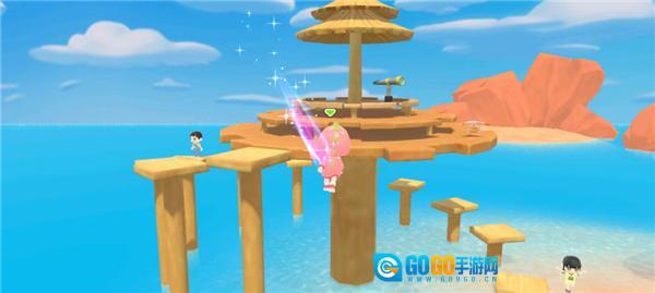 1、找到图中浪漫海岛上的观景台。(需要通过跳梅花桩到达顶部哦)