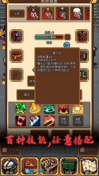 2、高自由度策略玩法:武将、技能、部件可随心搭配组合,阵法能够自由布置,助力玩家打造出独一无二的专属战斗流派。