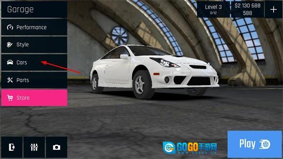 1、玩家可在游戏内购买全新赛车,操作方式为在主界面点击“cars”按钮进入车库。
