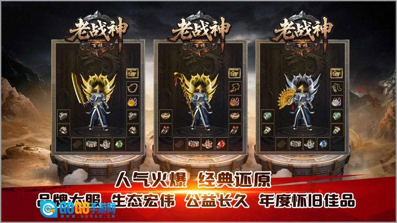 百福老战神,全新推出的1.80复古特色传奇!游戏玩法经典怀旧,带您重温当年原汁原味的传奇乐趣。游戏内小怪可爆勋章、斗笠、宝石材料、金币等一切物品,物价保值稳定,散人玩家尽可安心搬砖扛米。此外,游戏新增海量专属装备,小怪均有几率掉落,让您体验绿色游戏,回味传奇经典年代。
