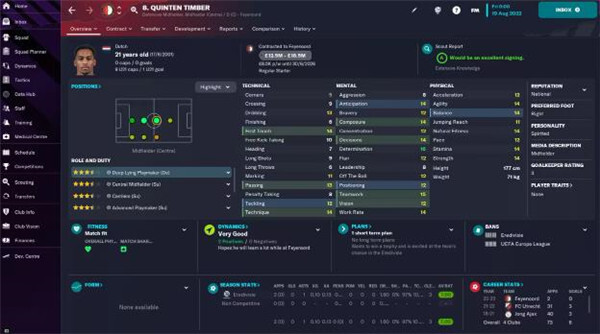 2、昆腾·廷伯在费耶诺德阵中,既要凭借自身能力抵御对手的压制,又需通过合理的判断帮助球队掌控球权;