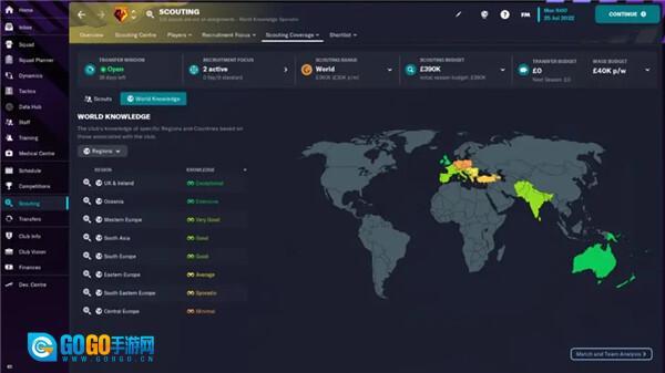 您可以随时通过球探搜索的考察覆盖面,查看俱乐部的世界知识等级。