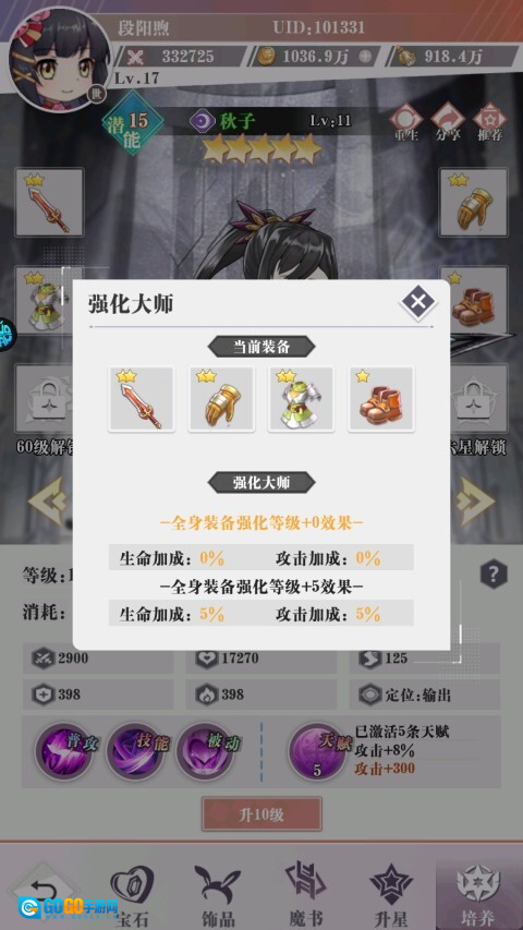 4、对装备进行强化操作同样能够提升属性,建议优先选择对全身装备同步强化,这样可以激活全身强化带来的额外效果。