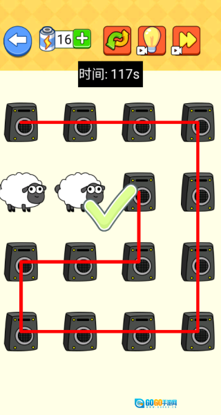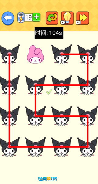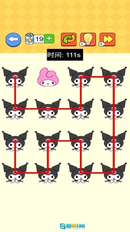 1、第一关需避开粉色兔子,用一条线将所有酷洛米连接起来,按照图中的路线绘制即可。